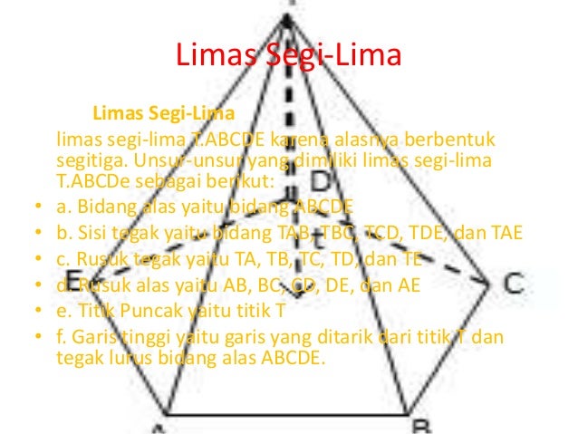 18+ Bangun Ruang Limas Segi Tujuh. Beberapa bangun ruang memiliki alas berbentuk bangun segibanyak, salah satunya segi lima. Bidang atas limas merupakan sebuah titik yang lancip.