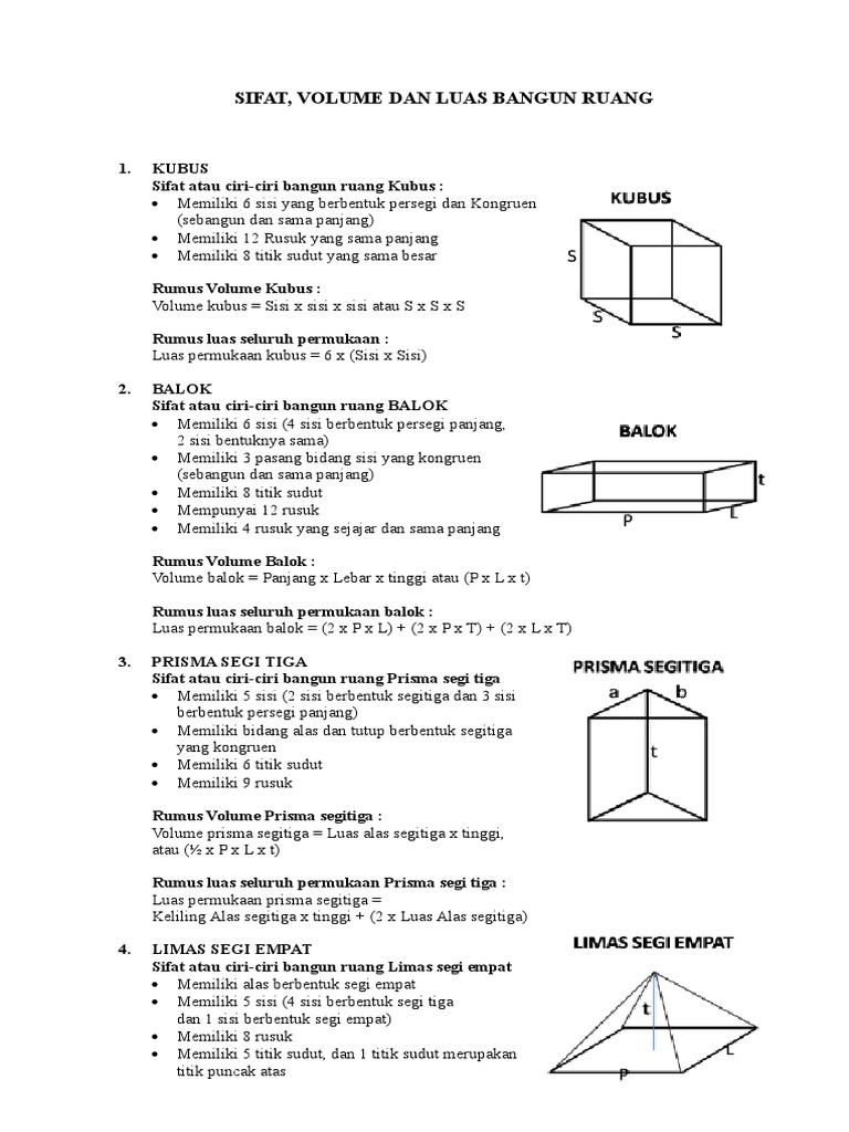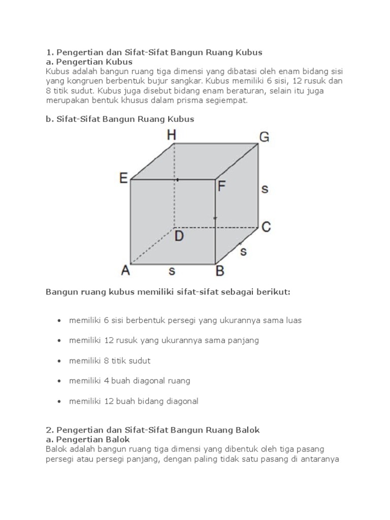 Memiliki 2 sisi (1 sisi berbentuk lingkaran sebagai alas dan 1 sisi lainnya berupa. Kubus memiliki 6 sisi, 12 rusuk dan 8 titik sudut. Perlu diketahui, kubus merupakan salah satu bangun ruang yang memiliki 3 dimensi serta memiliki panjang rusuk yang sama. Memiliki ukuran s x s x s.