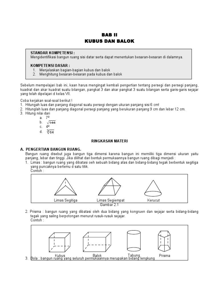 Kubus adalah kotak/balok yang istimewa karena semua rusuknya memiliki ukuran panjang yang dilihat dari parameter besaran dimensinya, kubus adalah bangun yang sederhana karena hanya berikut penjelasan dan contoh cara menghitungnya. Contoh soal beserta pembahasannya mengenai bangun ruang kubus, yuk simak penjelasannya di bawah ini : Balok adalah suatu bangun ruang yang mempunyai tiga pasang sisi segi empat. Jadi balok memiliki 4 buah diagonal ruang yang panjangnya sama semua.