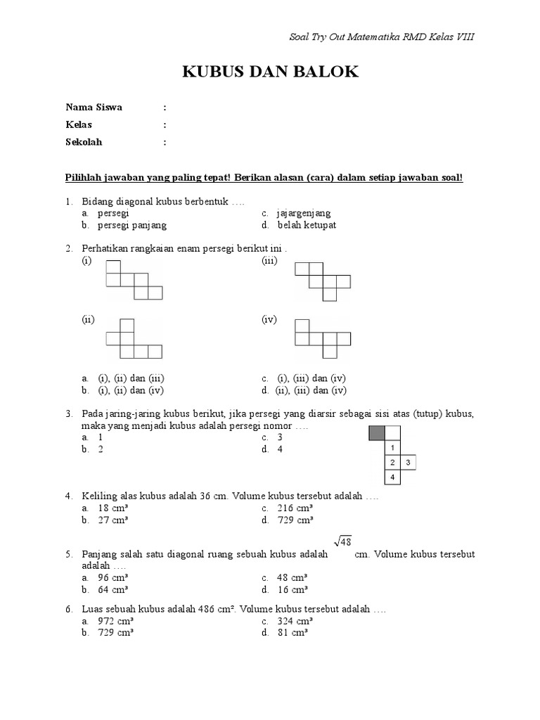 15+ Soal Ulangan Volume Kubus Dan Balok Kelas 5 Sd. Soal latihan ini terdiri dari mapel ppkn, bahasa indonesia, ipa, ips dan sbdp dengan jumlah soal 20 butir soal pilihan ganda. Jika lebar dan tinggi kotak buah itu adalah 100 cm dan 125 cm, maka panjangnya adalah ….
